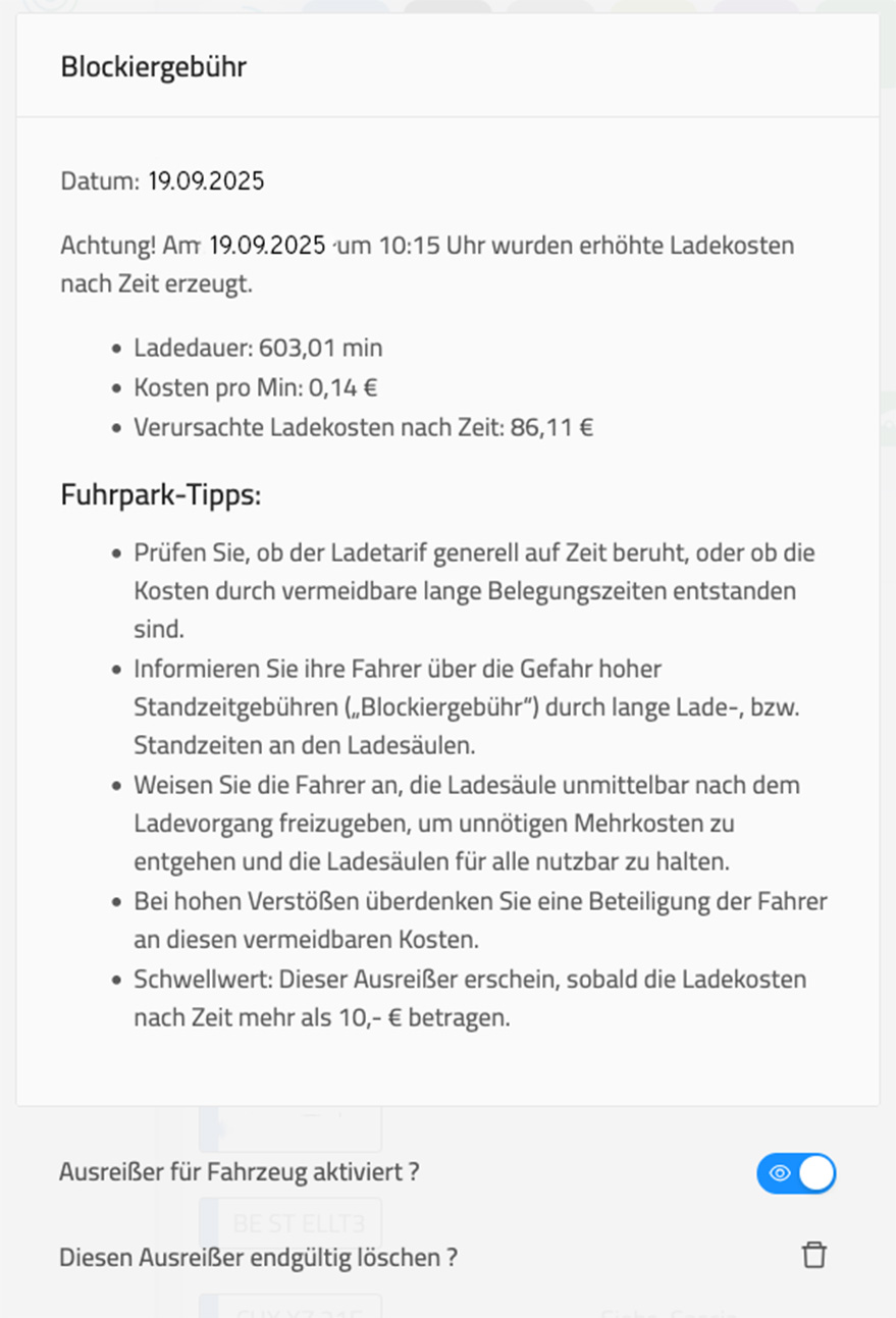 Auf der rechten Seite sind die Blockiergebühren aufgeführt. Wer oft lädt und nie eine Blockiergebühr verursacht, rutscht im Ranking ganz nach oben. So können Sie auch mal ein Lob aussprechen für besonders rücksichtsvolle Fahrer. Mit Klick auf „Details“ sehen Sie alle Blockiergebühren, die in dem gewählten Zeitraum verursacht wurden und können die Sortierung auch umdrehen.