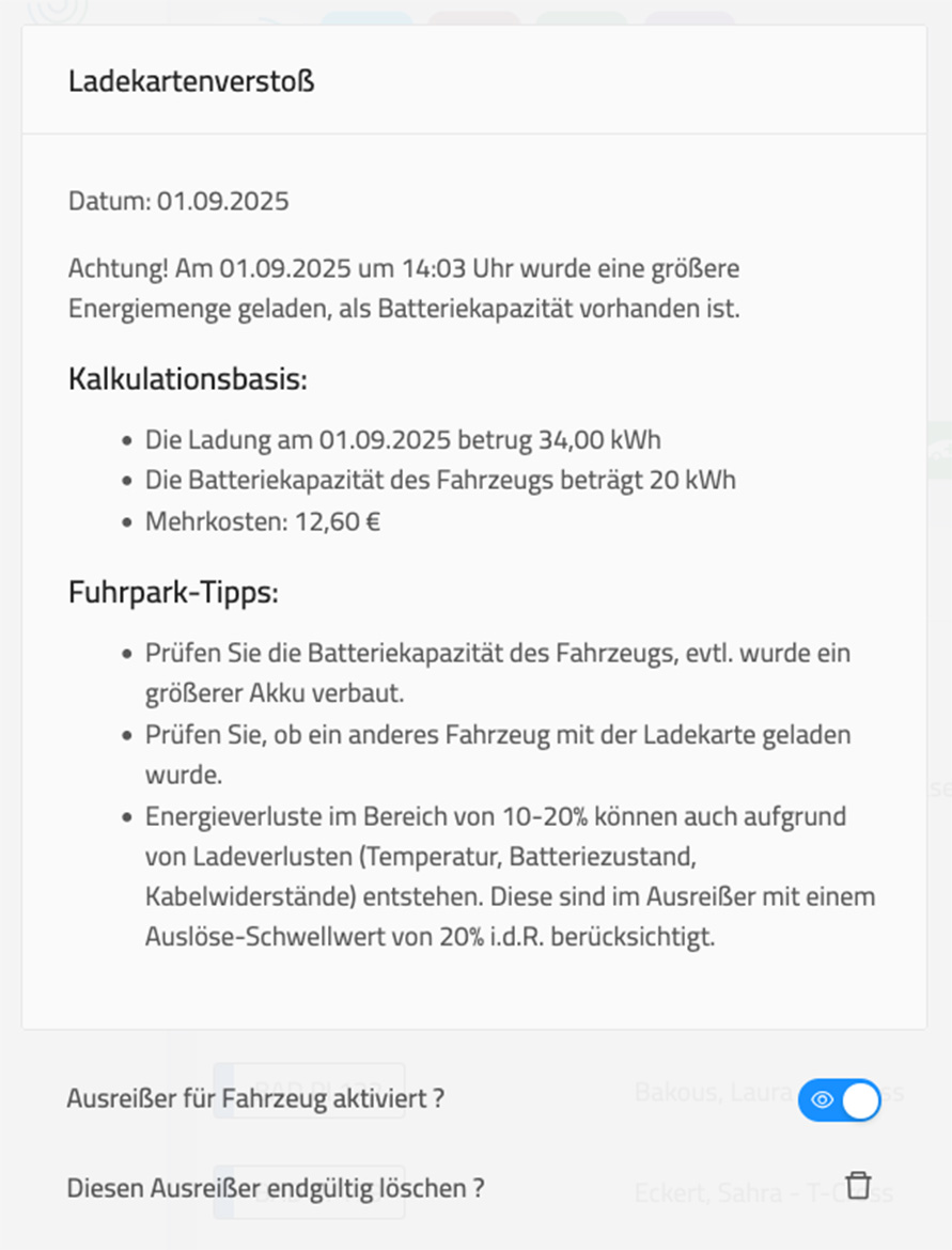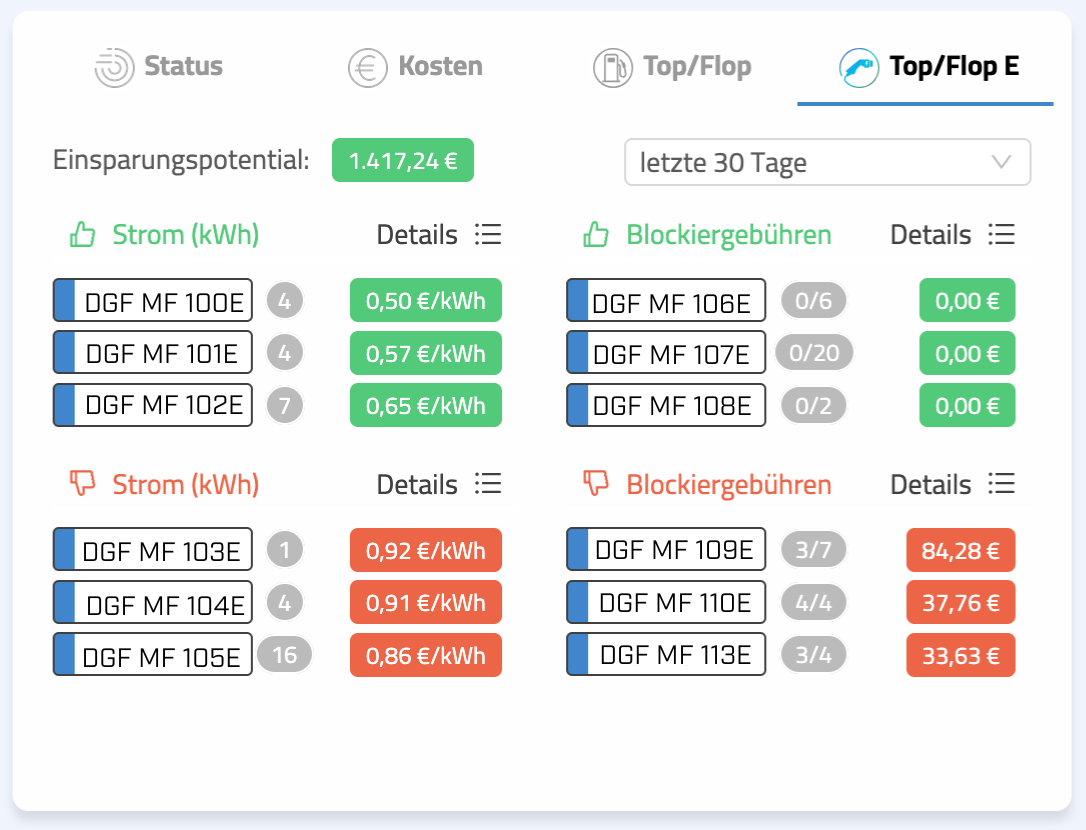 Die Abbildung unten zeigt echte Daten mit gefälschten Kennzeichen. Das Einsparungspotential setzt sich zusammen aus der Summe aller Blockiergebühren (des gewählten Zeitraums), plus die Summe, die Ihre E-Fahrer gespart hätten, wenn alle zum günstigsten Durchschnittspreis (in dem Fall 0,50 €/kWh) geladen hätten.